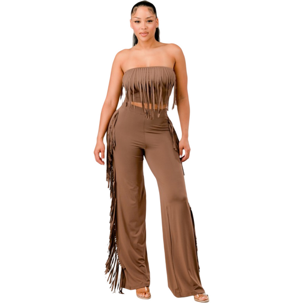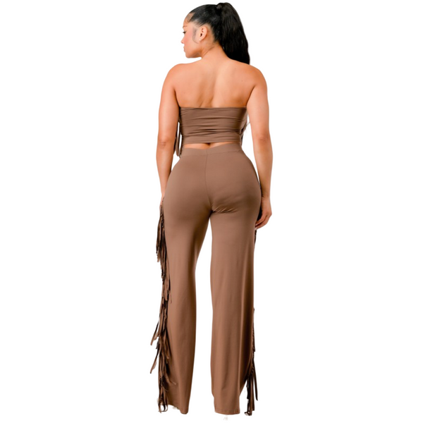 Upgrade your wardrobe with our Stretchy Pants Fringe Set in the color Mocha! The western style fringe accent adds a unique touch, while the stretchy material ensures a comfortable and flattering fit. Bring some southwestern flair to your looks with this stylish set.