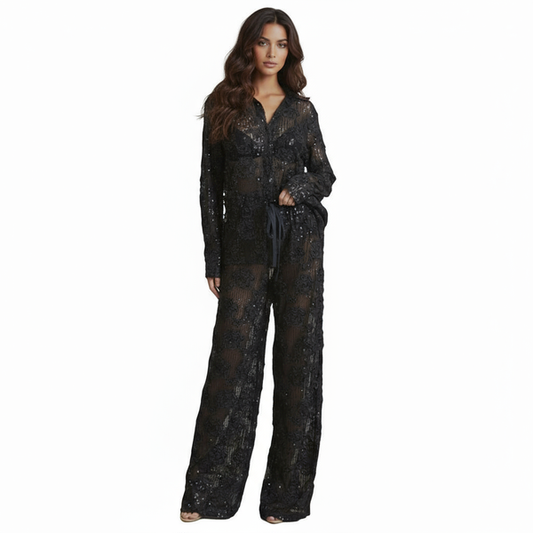 This 2 piece set is perfect for adding some sparkle to your wardrobe. The sequin mesh design adds a touch of glamour, while the lace detailing adds a delicate and feminine touch. Made with high-quality materials, this set is both stylish and comfortable. Elevate your look with this flower embroidery sequined and lace set.